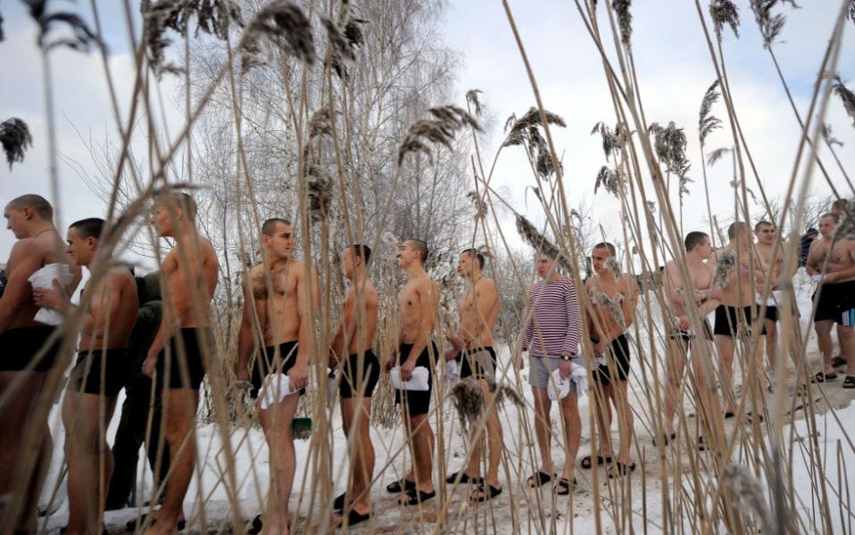 Πίσω από τις καλαμιές. Φορώντας τα μαγιό τους, με σαγιονάρες και την πετσέτα τους στο χέρι, οι στρατιώτες της Λευκορωσίας περιμένουν στην σειρά για να βουτήξουν στα παγωμένα νερά. Οι παλαιοημερολογίτες ορθόδοξοι χριστιανοί γιόρτασαν τα Θεοφάνια και απόδειξαν την πίστη τους με μια βουτιά στα παγωμένα(στην κυριολεξία) νερά.